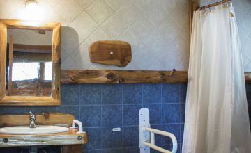 Cuentan con 2 dormitorios. Un dormitorio matrimonial en planta baja y otro muy amplio con 4 camas simples con somier o una cama matrimonial y 2 camas simples en planta alta. Y un sofá cama con 2 camas más en el living. El baño es muy amplio. Tiene una bañera, para el relax luego de la aventura.