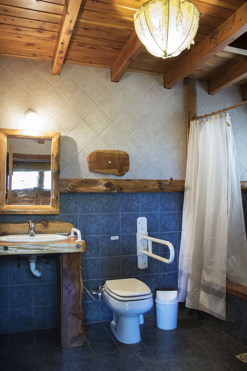 Está decorada y ambientada con artículos deportivos antiguos, como esquíes de madera y raquetas de nieve, y también con lámparas, sillones, mesa, etc… hechos artesanalmente con maderas, ramas y hojas del bosque..